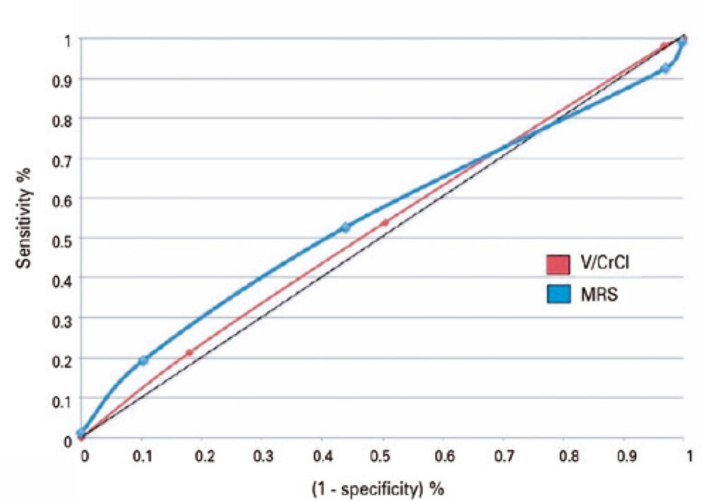 Mehran risk score demonstrated greater accuracy in predicting contrast-induced nephropathy when compared to contrast medium volume used/creatinine clearance ratio, however both presented similar values. The cutoff points with the closest incidence between the two scores were ≥10 for Mehran risk score (32.7%) and ≥5 for volume used/creatinine clearance ratio (34.3%).