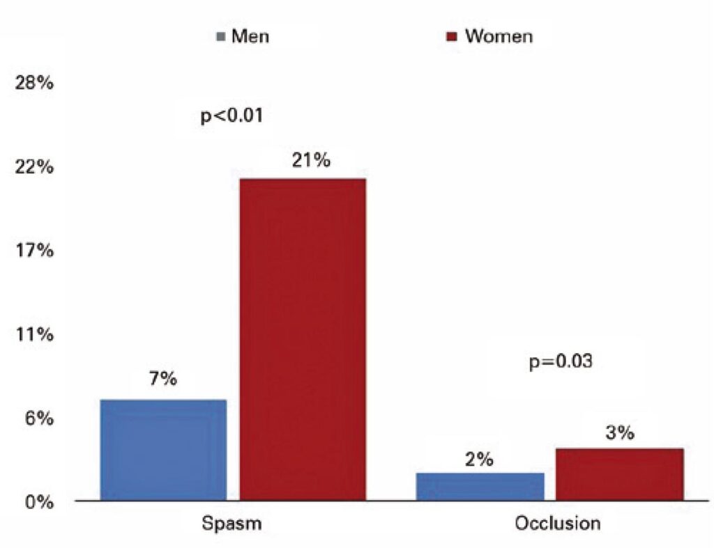 A total of 2,040 patients were included, of which 774 (37.5%) were female. Mean age was similar between sexes (62.2 years versus 61.5 years; p=0.27). The incidence of radial artery spasm was higher in women (21.2% versus 6.6%; p<0.01), as well as the incidence of radial artery occlusion (3.4% versus 1.8%; p=0.03). The use of nitroglycerin at the beginning of the procedure did not reduce the incidence of radial artery spasm in women when compared with placebo (19.7% versus 22.6%; p=0.34), nor did the rates of radial artery occlusion (4.3% versus 2.5%; p=0.17). The use of nitroglycerin at the end of the procedure did not reduce the incidence of artery occlusion in women (2.8% versus 3.9%; p=0.37).