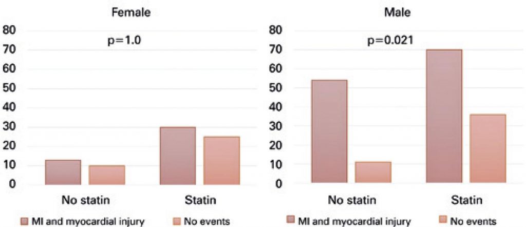 Periprocedural myocardial infarction and injury occurred in 26 (10.4%) and 141 (56.6%) patients, respectively. Male sex was associated with increased event rates (74.2% versus 57.3%; p=0.009). Statin pretreatment was correlated with lower event rates (59.8% versus 74.4%; 95%CI 0.29-0.92; p=0.025). Protective effects of statins remained significant following multivariate analysis accounting for sex and beta-blocker use (OR: 0.37; 95%CI 0.19-0.75; p=0.005).