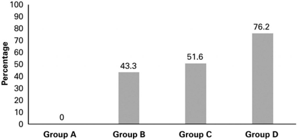 Two hundred twenty-two consecutive patients who presented spontaneously at the hospital from February 2008 to July 2013 and who underwent primary PCI were included in the study. During this period, the following strategies were implemented in a hierarchical manner: systematic measurement of door-to-balloon time (Group A), universal communication code (Group B), patient screening (Group C), and emergency cardiologist (Group D).