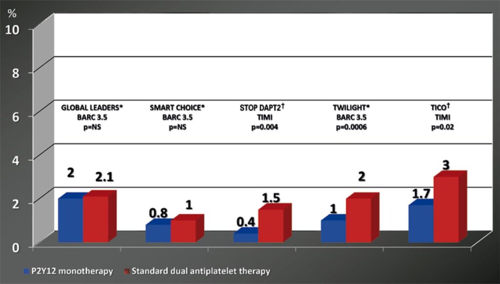 Since the mid-1990s, the dual antiplatelet therapy, consisting of the association between acetylsalicylic acid and a platelet P2Y12 receptor inhibitor, is the core of thrombosis prevention after coronary stent implantation, regardless of the models used. It is also used to prevent the occurrence of atherothrombotic events in the late phase after the intervention. The clinical presentation of coronary artery disease influences the duration of dual therapy, which tends to be longer in treated cases of acute coronary syndrome (usually for one year), when compared to cases of chronic coronary disease (often for up to 6 months). After this period, the P2Y12 inhibitor is usually discontinued, and monotherapy with aspirin is maintained. However, in the last two decades, it has been observed that prolonged use of two associated antiplatelet agents predisposes treated cases to bleeding complications, with potentially severe consequences – including increased mortality. Thus, alternatives that minimize this risk have been considered and evaluated, such as early discontinuation of acetylsalicylic acid (between 1 and 3 months after discharge), or the so-called monotherapy with P2Y12 inhibitors, aiming to reduce bleeding without compromising prevention of ischemic events. In the last decade, a series of randomized clinical trials evaluated this hypothesis, generally resulting in reduced bleeding complications, although not necessarily of those classified as major, with no significant increase in the most relevant cardiovascular events. This review discusses the main results of these clinical trials and their potential clinical implications for routine cardiology practice.