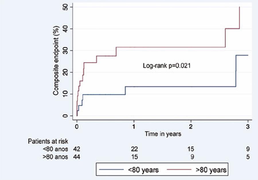 There was a greater incidence of total mortality in the group ≥80 years (p=0.043), as well as in the composite endpoint of total mortality, non-fatal myocardial infarction, and stroke (p=0.02). There was no difference between the groups regarding procedure success (90% vs. 95%; p=0.43), safety endpoints (34% vs. 21%; p=0.19), and 30-day efficacy (30% vs. 14%; p=0.09), as well as in the rate of vascular (11% vs. 12%; p=0.97) and hemorrhagic (14% vs. 9%; p=0.55) complications, and in length of hospital stay (9 vs. 7 days; p=0.31). There was a greater incidence of renal failure in the group ≥80 years (18.4% vs. 2.4%; p=0.04). After adjustments for relevant clinical factors, an age ≥80 years was no longer an independent predictor of mortality (p=0.06), but remained as an independent predictor of the composite endpoint (p=0.03).