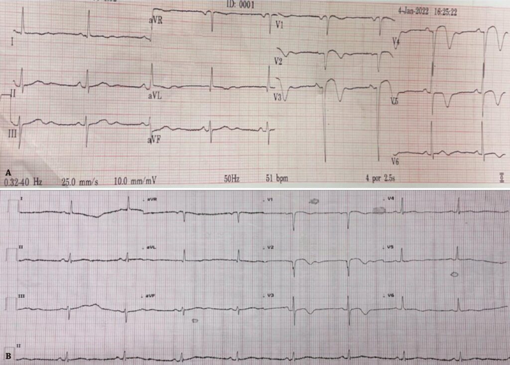 Wellens syndrome was described by Zwaan, Bär and Wellens, in 1982. On the electrocardiogram, T wave morphological alterations are observed in precordial leads, suggesting severe proximal stenosis of the left anterior descending coronary artery and an imminent risk of acute myocardial infarction and/or sudden death, with slight or no alteration in serum troponin. Its early recognition and management with early myocardial reperfusion avoid unfavorable outcomes. Percutaneous coronary intervention and surgical myocardial revascularization are the most used strategies for treatment. The authors describe two cases of types A and B Wellens syndrome treated with different reperfusion strategies.