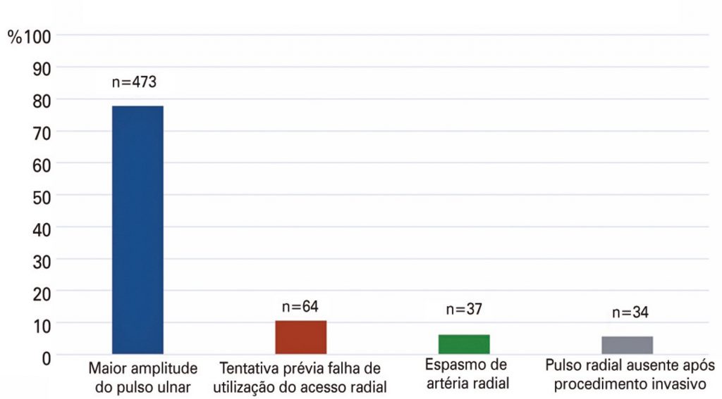 É baixa a utilização da técnica ulnar como via de acesso alternativa, mas mostra-se útil em situações nas quais a artéria radial apresenta-se inadequada à punção ou em casos de insucesso na tentativa de sua canulação.