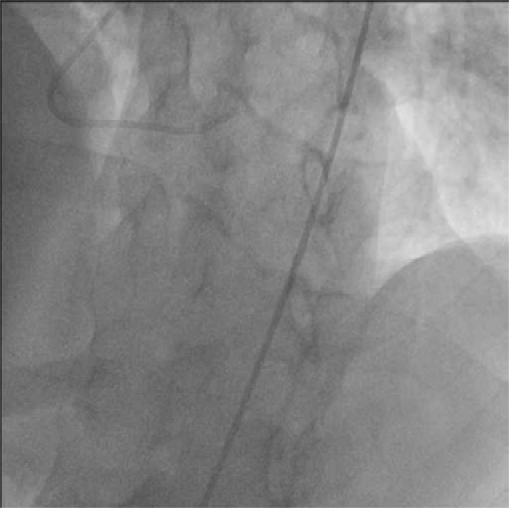 Injeção de contraste na artéria coronária esquerda mostra enchimento retrógrado da artéria coronária direita e seus ramos, com padrão de fluxo bidirecional.