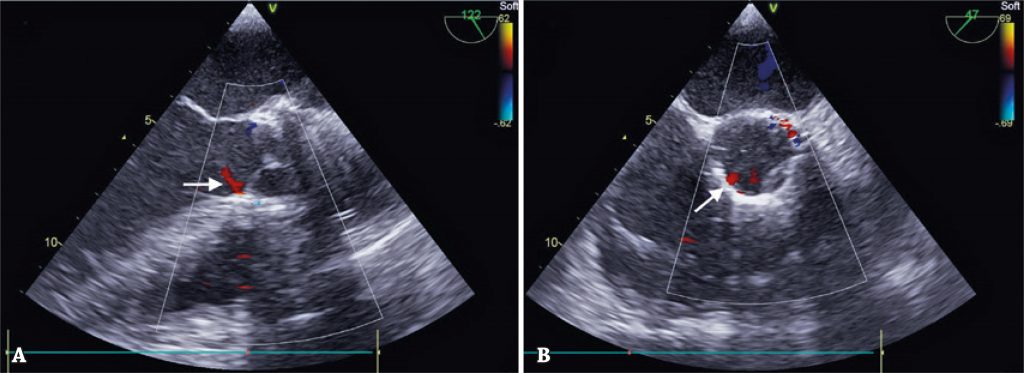 Resultado ecocardiográfico. Seta indicando discreta regurgitação paraprotética. (A) Eixo longo da aorta. (B) Eixo transversal da aorta.