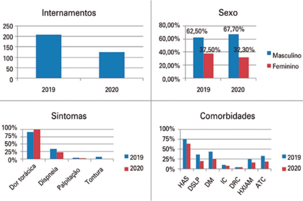 Houve redução de 40,38% na incidência de internamentos pelos diagnósticos citados em 2020 em comparação a 2019. Não houve diferença entre dias de início de sintomas entre os anos comparados, dias de internamento ou número de comorbidades apresentadas pelos pacientes, apesar de haver maior número de diagnósticos de angina instável e de presença de dor torácica nos indivíduos atendidos em 2020.