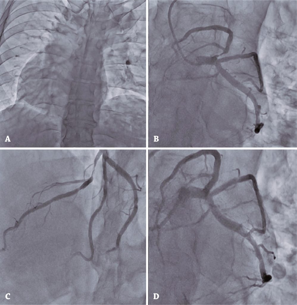 Cinecoronariografia e intervenção coronária percutânea. (A) Dextroposição. (B/C) Grave lesão proximal da descendente anterior. (D) Resultado da intervenção coronária percutânea com implante de stents.