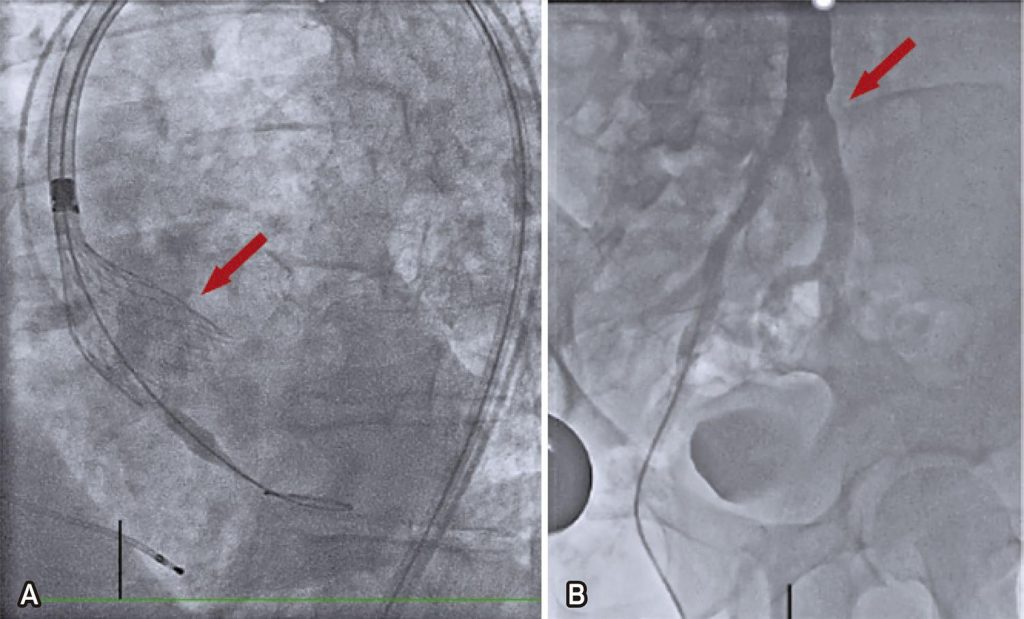 Angiografia. (A) Liberação (seta) de prótese autoexpansível CoreValve Evolut R 34mm (Medtronic®, Santa Rosa, CA). (B) Resultado da bifurcação da artéria ilíaca comum após tratamento com litotripsia intravascular (seta).