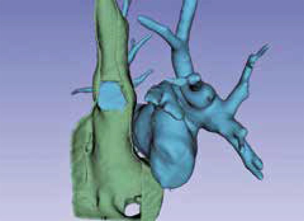 A comunicação interatrial do tipo seio venoso superior geralmente acompanha-se de uma conexão venosa anômala de veia ou veias pulmonares superiores ou médias direitas, que drenam diretamente na veia cava superior ou, ainda, na junção cavoatrial. Relatamos o caso de uma paciente do sexo feminino, de 62 anos, com diagnóstico de comunicação interatrial do tipo seio venoso, com sobrecarga das câmaras direitas, para quem foi planejado o procedimento de oclusão percutânea do defeito por meio da realização prévia de tomografia cardiovascular e, sequencialmente, estudo anatômico tridimensional, com o software de acesso público 3D Slicer. Além disso, foi realizada a impressão do modelo em resina para inspeção e simulação de implante de um stent. A paciente foi tratada de maneira percutânea com um stent Chetham-Platinum coberto de 60mm de extensão, com oclusão total do defeito, ausência de shunts residuais e direcionamento do fluxo da veia pulmonar superior direita para o átrio esquerdo por comunicação posterior entre os átrios, condição essencial para a realização desse tipo de procedimento. O planejamento do procedimento de oclusão percutânea da comunicação interatrial do tipo seio venoso passa por avaliação criteriosa dos exames de imagem. A impressão de modelos virtuais ou físicos, derivados da angiotomografia cardíaca, é fundamental para estudo detalhado do defeito e das estruturas anatômicas associadas, minimizando a ocorrência de complicações.