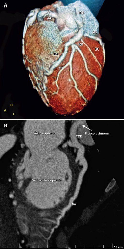 (A e B) Angiotomografia coronariana. Tronco da artéria coronária esquerda (TCE) origina-se no tronco pulmonar, medindo 7,3 mm de diâmetro. A artéria descendente anterior (DA) contorna o ápice do ventrículo esquerdo, medindo até 6,8 mm de diâmetro. A artéria circunflexa (Cx), de grande importância, apresenta ectasia em seu terço proximal, medindo até 6 mm de diâmetro. A artéria coronária direita (CD) origina-se do seio coronário direito, medindo até 8 mm no seu maior diâmetro.