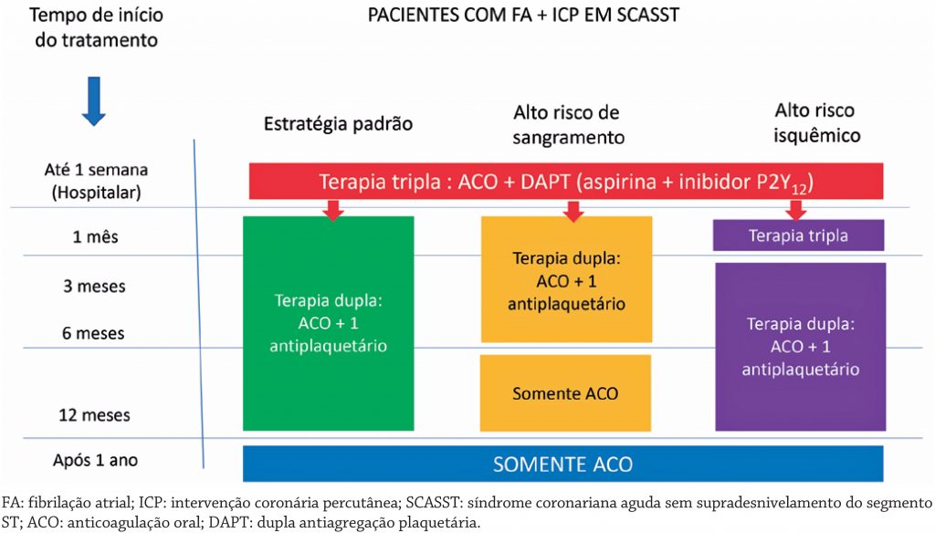 O manuseio antitrombótico ideal em portadores de fibrilação atrial e submetidos à intervenção coronária percutânea eletiva ou em síndrome coronária aguda não está definitivamente estabelecido. A dupla antiagregação plaquetária (aspirina e inibidores do receptor P2Y12) reduz a trombose dos stents e os eventos isquêmicos subsequentes. Por sua vez, a presença de fibrilação atrial requer a anticoagulação oral para a prevenção de acidente vascular cerebral e outras complicações tromboembólicas. Entretanto, a combinação desses dois tratamentos, conhecida como terapia tripla, eleva o risco de sangramentos graves, com impacto prognóstico negativo. A utilização dos anticoagulantes diretos, que reduzem as taxas de sangramento relativamente à varfarina, juntamente da manutenção de apenas um antiplaquetário (os inibidores da P2Y12), conhecida como terapia dupla, pode ser uma alternativa mais segura nesses pacientes. Neste artigo, revisamos os vários estudos randomizados comparando a terapia tripla versus a dupla, além de metanálises desses estudos e as condutas sugeridas pelas diretrizes mais recentes, discutindo as vantagens e desvantagens desses tratamentos, em termos de segurança e eficácia nesse importante e crescente subgrupo de pacientes.